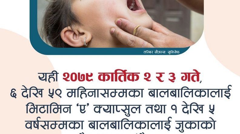 काठमाण्डौ – कात्तिक २ बुधवार र ३ गते विहिवार देशभरका बालबालिकालाई भिटामिन ‘ए’ र जुकाको औषधि खुवाउने अभियान सुरु हुने भएको छ । स्वास्थ्य मन्त्रालयले सूचना निकालेर ६ महिनादेखि ५९ महिनासम्मका बालबालिकालाई भिटामिन ‘ए’ क्याप्सुल र एकदेखि पाँच वर्षसम्मका बालबालिकालाई जुकाको औषधि खुवाइने जनाएको छ । मन्त्रालयले आफ्ना बालबालिकालाई नजिकैको महिला सामुदायिक स्वास्थ्य स्वयंसेविकामार्फत भिटिामिन ‘ए’ र जुकाको औषधि खुवाउन आग्रह गरेको छ । छ महिनादेखि ५९ महिनासम्मका बालबालिकामा हुनसक्ने स्वास्थ्य जटिलता तथा कुपोषणको जोखिम न्यूनीकरण गर्नका लागि सरकारले २०५३ सालदेखि भिटामिन ’ए’ कार्यक्रम सञ्चालन गर्दै आएको छ ।