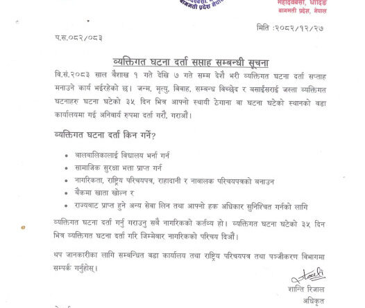 • व्यक्तिगत घटना दर्ता सप्ताह सम्बन्धी थाक्रे गाउँपालिकाको सूचना
